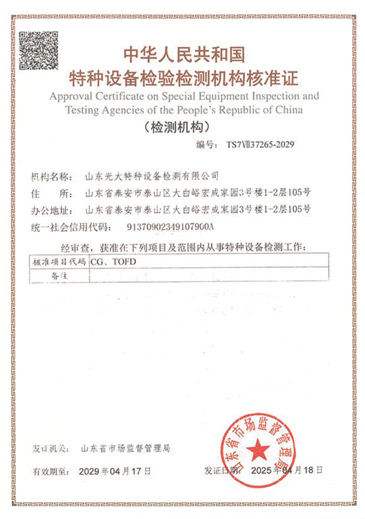 山東光大特種設(shè)備檢測(cè)有限公司是經(jīng)山東省市場(chǎng)監(jiān)督管理局核準(zhǔn)的甲類(lèi)B1特種設(shè)備綜合檢驗(yàn)機(jī)構(gòu)。2017年9月30日取得了山東省市場(chǎng)監(jiān)督管理局頒發(fā)的《檢驗(yàn)檢測(cè)機(jī)構(gòu)資質(zhì)認(rèn)定證書(shū)》。2018年2月22日取得了山東省市場(chǎng)監(jiān)督管理局頒發(fā)的《特種設(shè)備檢驗(yàn)檢測(cè)機(jī)構(gòu)核準(zhǔn)證》(起重機(jī)械)檢驗(yàn)檢測(cè)資質(zhì)。2021年11月取得山東省市場(chǎng)監(jiān)督管理局版發(fā)的《特種設(shè)備檢驗(yàn)檢測(cè)機(jī)構(gòu)核準(zhǔn)證》(安全閥在線(xiàn)、離線(xiàn))校驗(yàn)資質(zhì)。2023年11月取得山東省市場(chǎng)監(jiān)督管理局頒發(fā)的甲類(lèi)檢驗(yàn)機(jī)構(gòu)B1《特種設(shè)備檢驗(yàn)檢測(cè)機(jī)構(gòu)核準(zhǔn)證》,具有壓力容器(RD2...